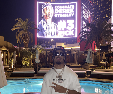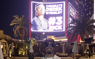 Surprised Derek Stingley at Draft party with 100,000 sq ft. hotel façade on the Las Vegas strip after he was drafted third pick overall in the 2022 NFL Draft to the Houston Texans.